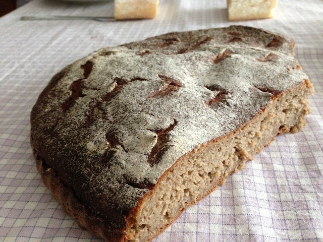 Y con el mismo sistema, unos días más tarde hicimos este otro pan redondo con menos altura porque lo horneamos en un recipiente de silicona bajo para tartas o quichés .... Otro detalle que le potencia el sabor acaramelado del centeno en el horneado es dejarlo que se tueste un poco más.... Estamos hablando de panes para valientes...pero te sorprenderás de lo que puede gustarle a los niños... cuidado que no te lo coman en un descuido...jejeje